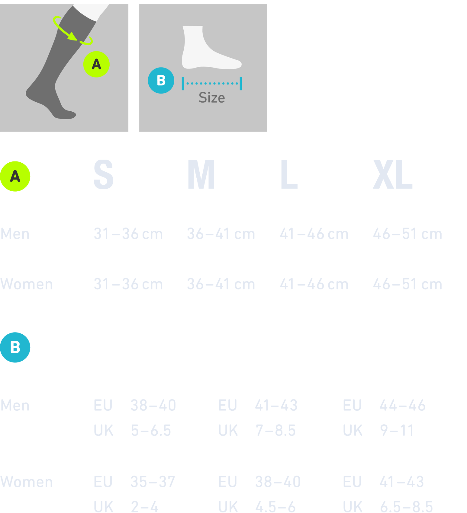 The correct size of the Run Ultralight Compression Socks is selected using the shoe size and the widest calf circumference. This ensures an ideal fit on the skin for maximum effectiveness. They are made in Germany according to the highest quality standards.