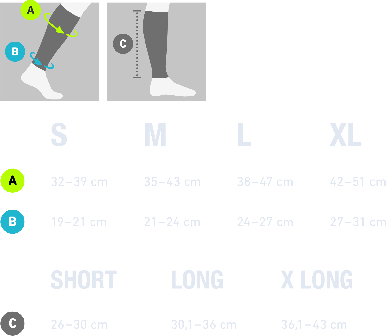 A) Measure the circumference of your calf at the largest point. B) Measure the circumference of your ankle at the narrowest point. C) Measure the length of your calf: start two fingers below the kneecap and measure down to the narrowest point of the ankle.